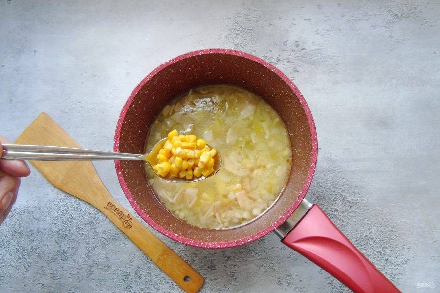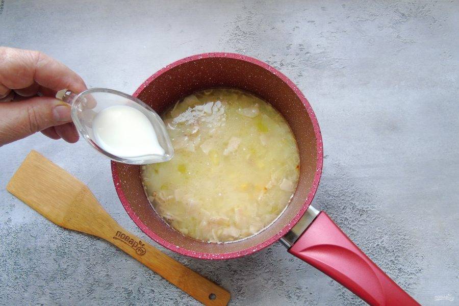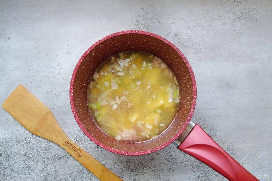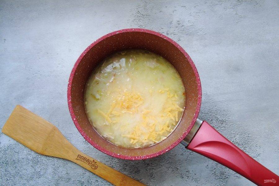 Сыр натрите на терке и перемешайте с крахмалом. Добавьте в суп. Благодаря этой нехитрой процедуре, сыр не опустится на дно кастрюли одним комком, а следовательно быстрее растворится. Варите суп до полного растворения сыра. В конце посолите и поперчите по вкусу.