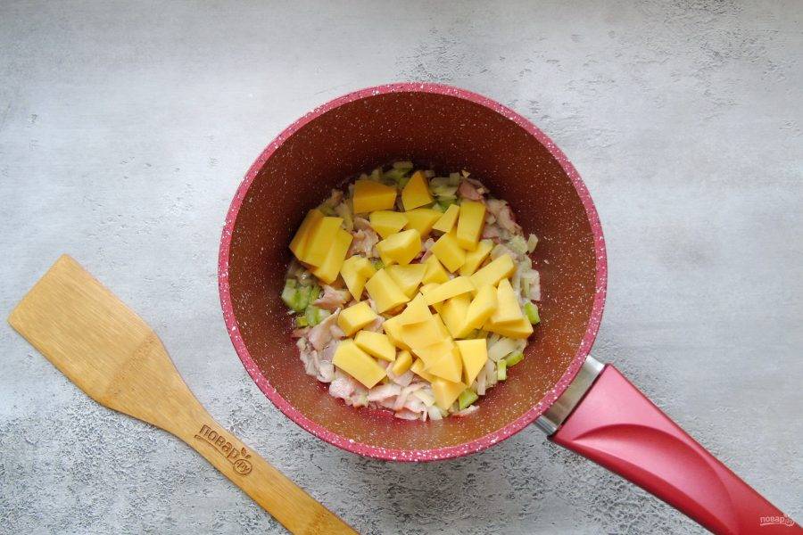 Выложите в кастрюлю нарезанный кубиками картофель.