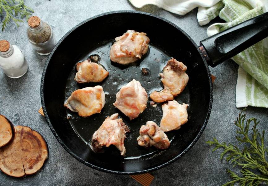 Курицу сполосните, обсушите и порежьте на части. В сковороде разогрейте растительное масло и обжарьте курицу на сильном огне до золотистой корочки.
