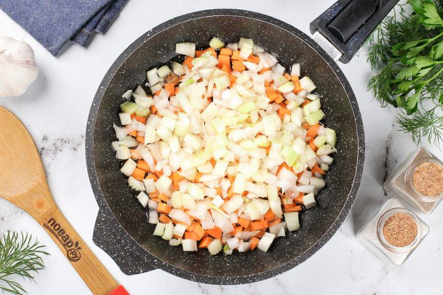 В разогретую сковороду с маслом выложите нарезанные кубиками морковь, лук и стебель сельдерея.
