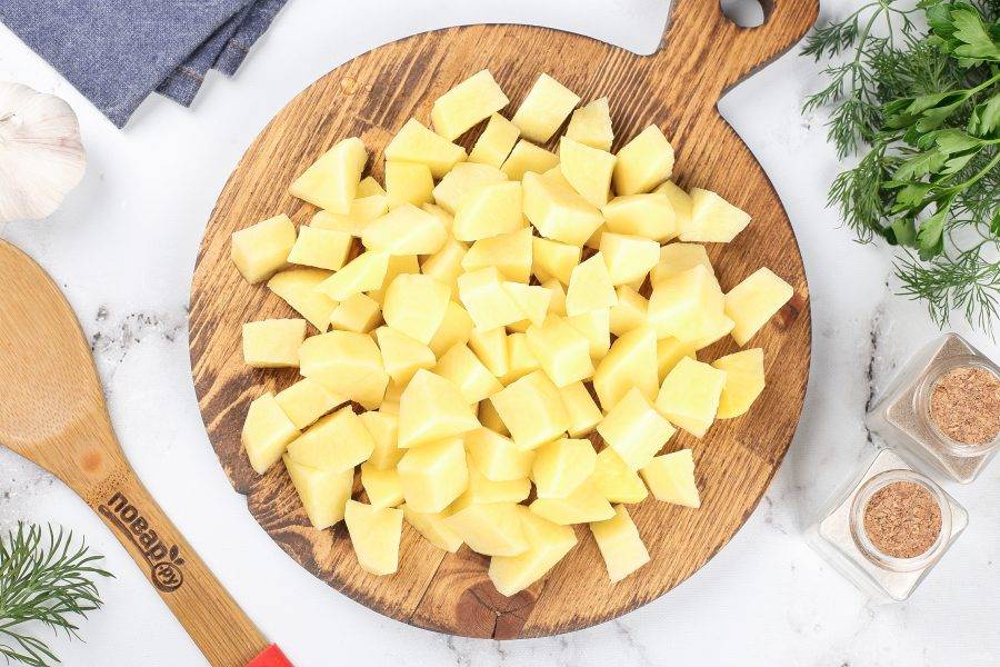 Перелейте бульон в кастрюлю. Добавьте крупу и картофель. Варите при умеренном кипении, пока картофель не будет почти готов.
