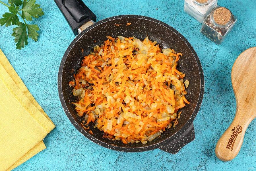 Пока готовится картофель в сковороде обжарьте тёртую морковь и нарезанный кубиками лук.