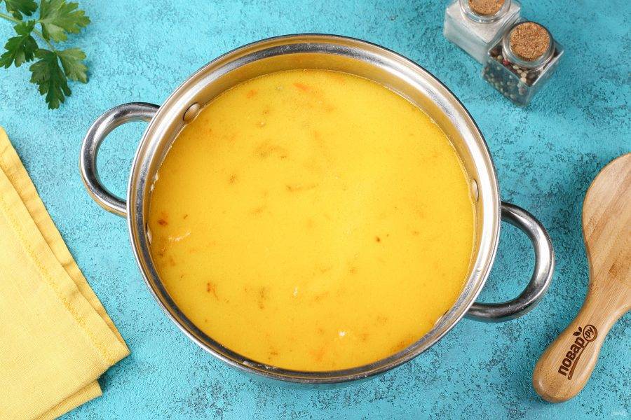 Отрегулируйте на соль и готовьте всё вместе, после закипания, ещё около 2-3 минут. Снимите кастрюлю с огня и дайте супу настояться под крышкой ещё примерно 10 минут.