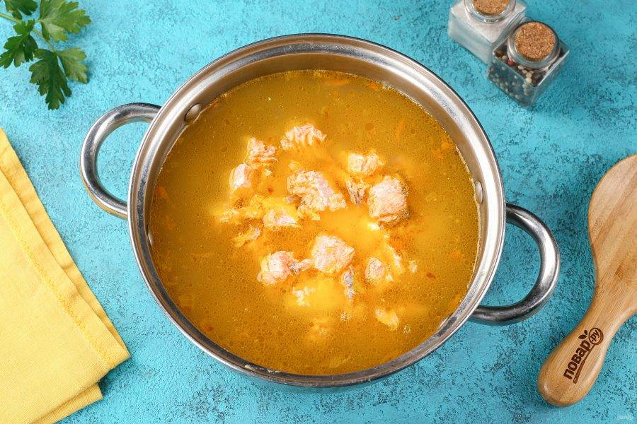 Добавьте процеженный рыбный бульон и варите после закипания около 15 минут.
