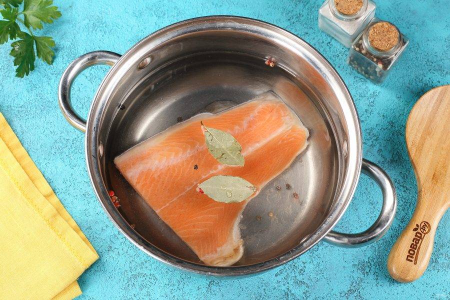 Сёмгу промойте, залейте водой, добавьте лавровый лист и перец горошком. Доведите до кипения, снимите пену, и на умеренном огне готовьте около 20 минут. Готовый бульон процедите, а рыбу отделите от костей если необходимо и нарежьте небольшими кусочками.