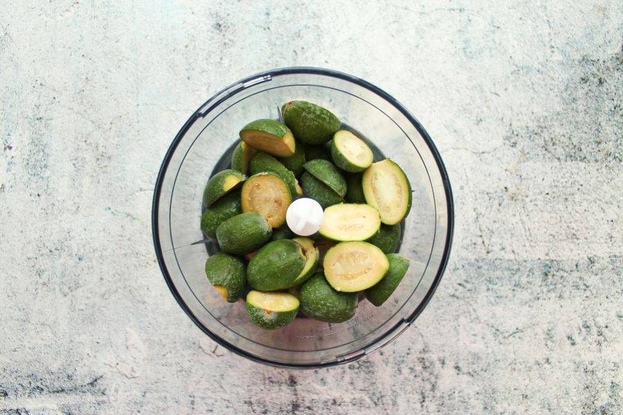 У фейхоа обрежьте хвостик, разрежьте плоды пополам и выложите их в чашу блендера.