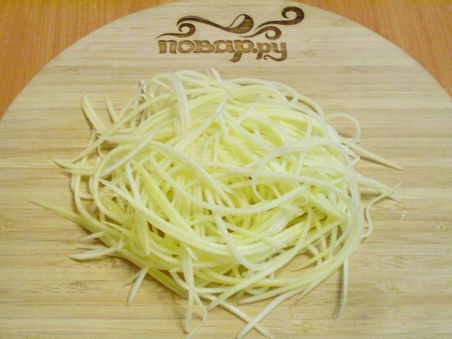 Очищаем от кожуры кабачок. И с помощью терки делаем длинные соломинки из кабачка, очень похожие на спагетти. Сердцевину кабачка, там, где молоденькие семена, не трем.