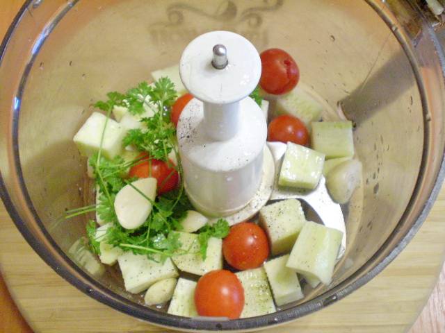 Оставшийся кабачок, помидоры, зелень и чеснок измельчаем в комбайне. Можно влить немного воды. Это будет соус для пасты.