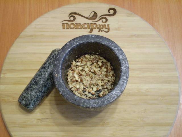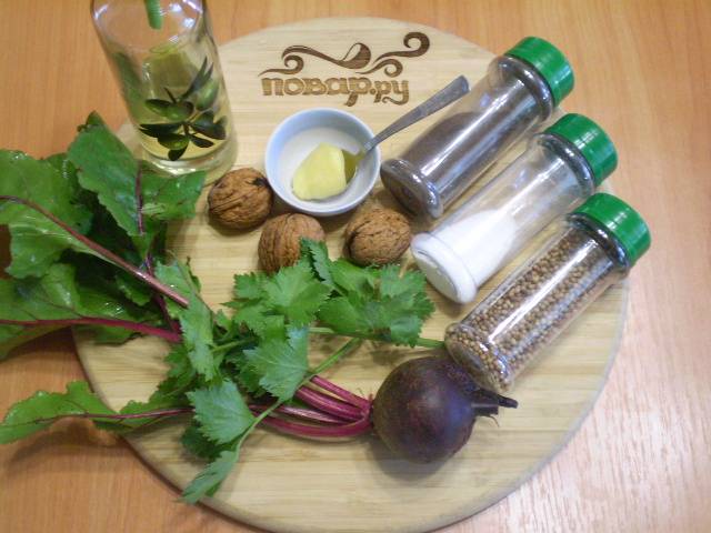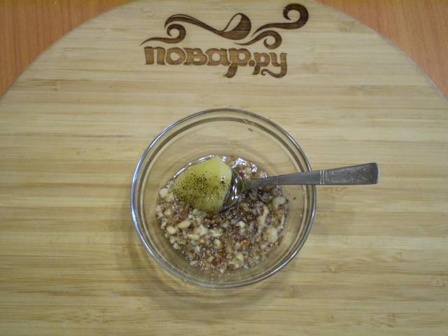 В тарелочке смешиваем орехи, кориандр, черный молотый перец, мед, уксус и масло оливковое. Заправка для салата готова.
