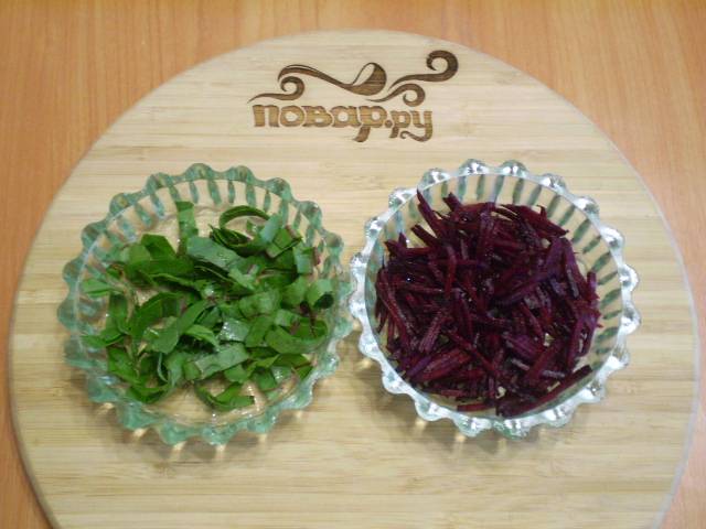 Режем, соломкой свеклу (не крупно). Ботву можно порезать широкими полосками.