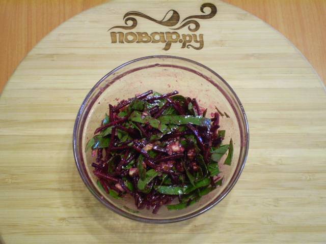 В глубокой посуде соединяем свеклу, свекольную ботву и другую зелень с заправкой.