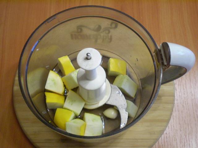 Кабачок должен быть молоденьким, старые или перезревшие плоды не подходят. Если кожура молоденькая и мягкая, снимать её не нужно. Просто порежьте кабачок на кусочки и положите в комбайн. Налейте воду, посолите, и добавьте зубчик чеснока. Отправьте пюрироваться.