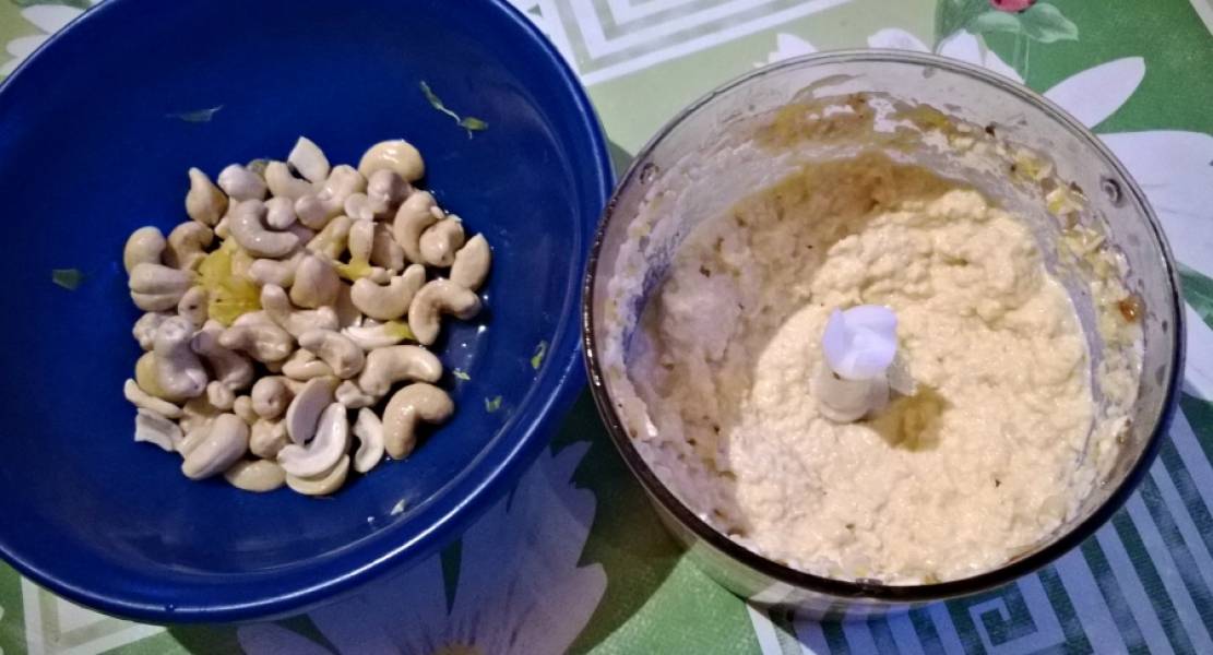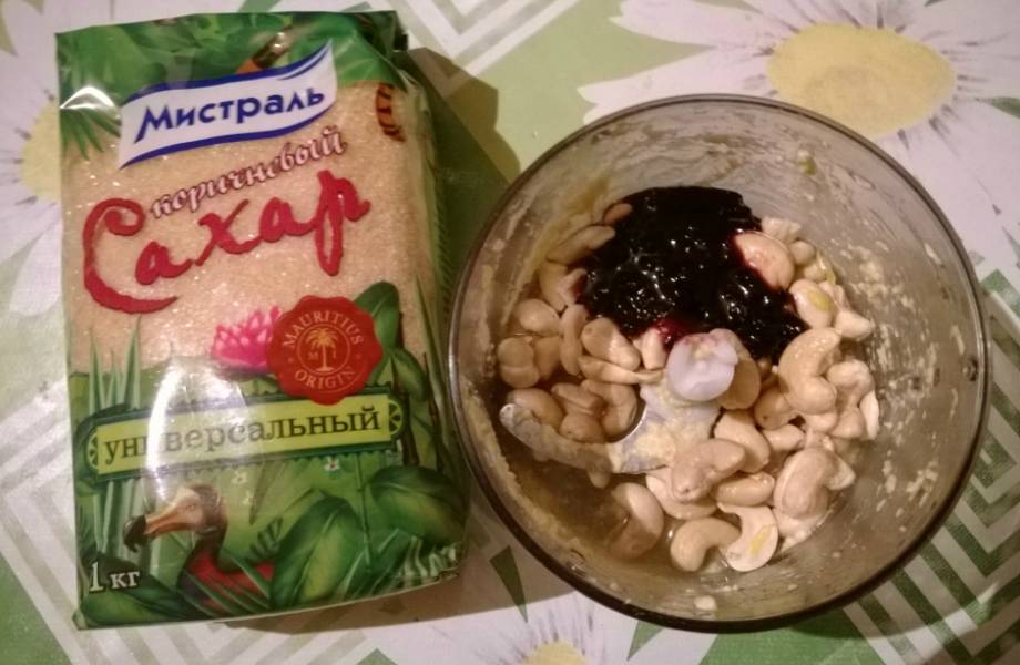 Кешью и миндаль предварительно замочить в воде минимум на 2 часа, лучше на ночь. Сложить в блендер кешью, добавить 2 ст. л. сахара и пробить в блендере, чтобы орехи немного измельчились. Добавить очищенный от белой пленки апельсин и превратить в однородную массу. Попробуйте на вкус, возможно нужно добавить немного сахара. Массу распределить поверх финикового слоя.