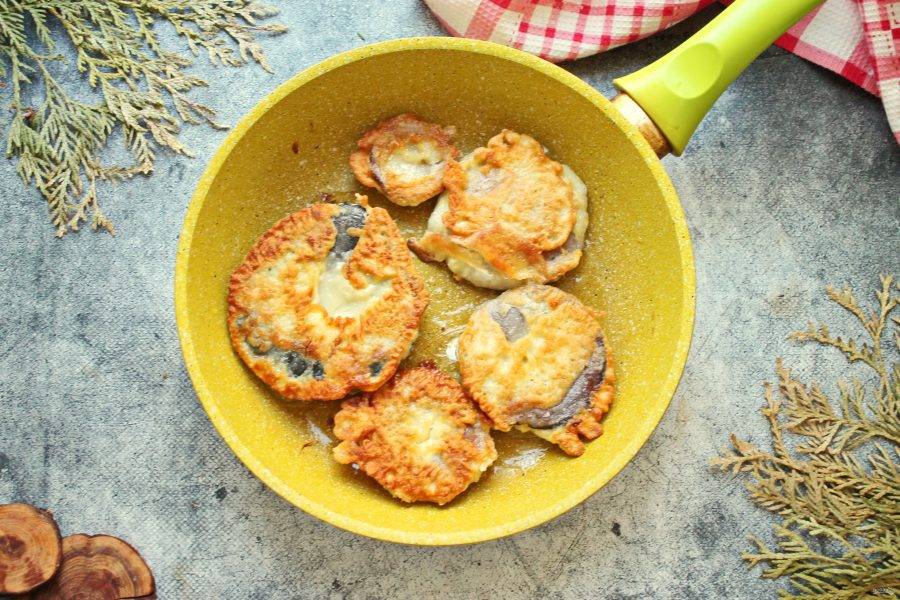 В сковороду налейте растительное масло и разогрейте на среднем огне. Каждую сыроежку в муке опустите в кляр и полностью их покройте. Выложите сыроежки в сковороду и обжаривайте с двух сторон до золотистой корочки. Готовые сыроежки переложите на бумажную салфетку, чтобы удалить лишнее масло. Готовые сыроежки в кляре сразу подавайте на стол.