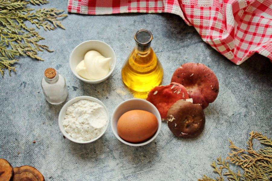 Подготовьте все необходимые ингредиенты для приготовления сыроежек в кляре. Сыроежки почистите и аккуратно вымойте.