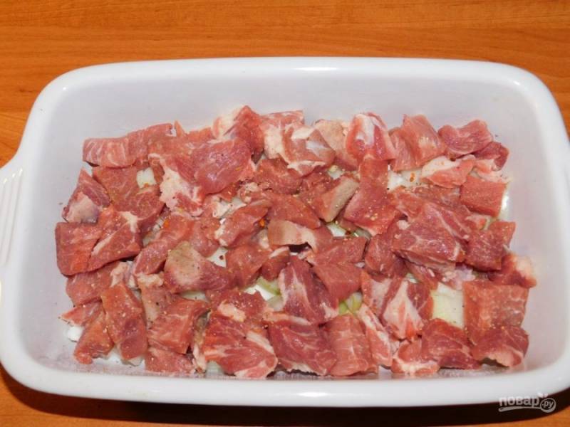 Затем выложите нарезанное мясо. Добавьте по вкусу соль и специи.