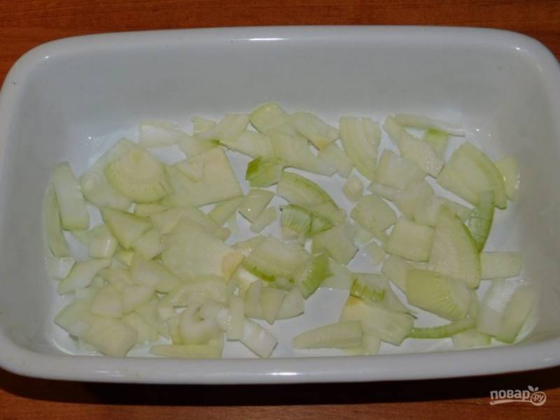 На дно формы для запекания выложите нарезанный лук.
