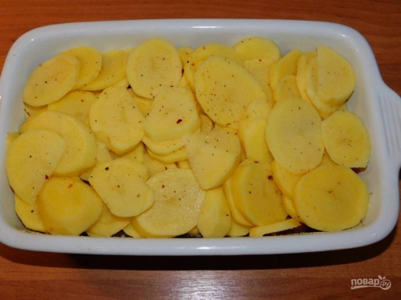 Картофель нарежьте кружками и разложите поверх мяса. Посолите. Накройте фольгой и поставьте в духовку, разогретую до 200 градусов на 40 минут.