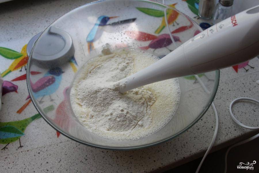 Постепенно добавим муки и еще раз взобьем. Обязательно смотрите, чтоб не образовалось в смеси комков или \"островков\" с мукой.