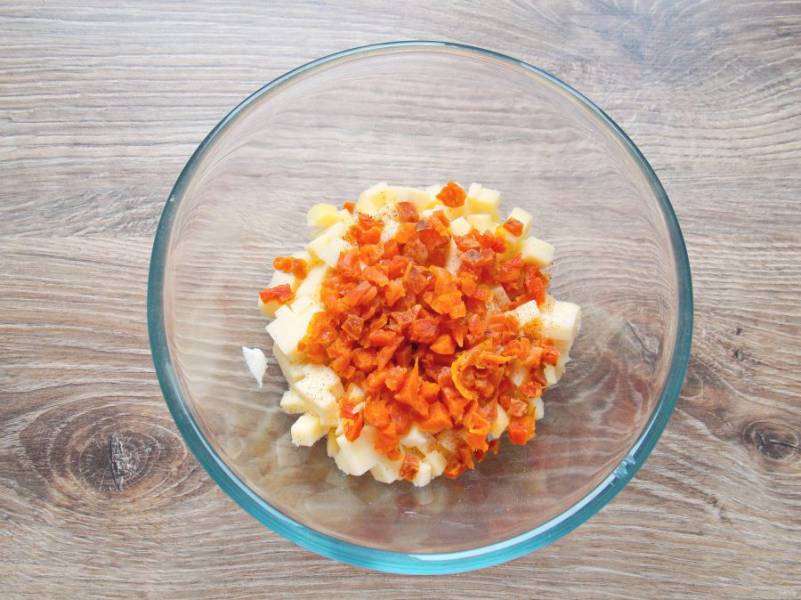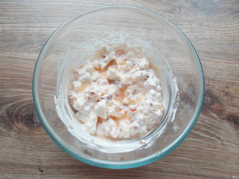 Курагу промойте и залейте на 5 минут горячей водой. Извлеките из воды, обсушите и порежьте мелким кубиком. Добавьте ее в миску со сметаной и сыром, посолите по вкусу и перемешайте.