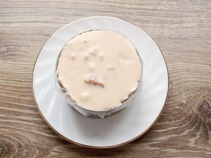 Кулинарное кольцо намочите обычной водой и проложите бока пленкой. Переложите во внутрь кольца всю массу и разровняйте верх.