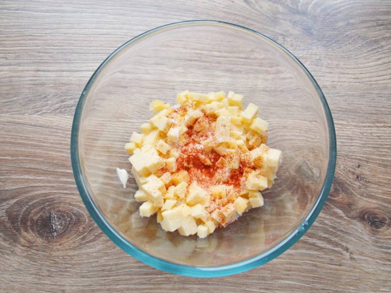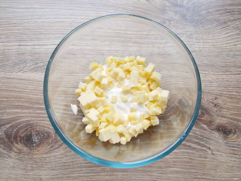Твердый сыр, у меня домашний, порежьте мелким кубиком. В миску выложите сметану и добавьте порезанный сыр, перемешайте.