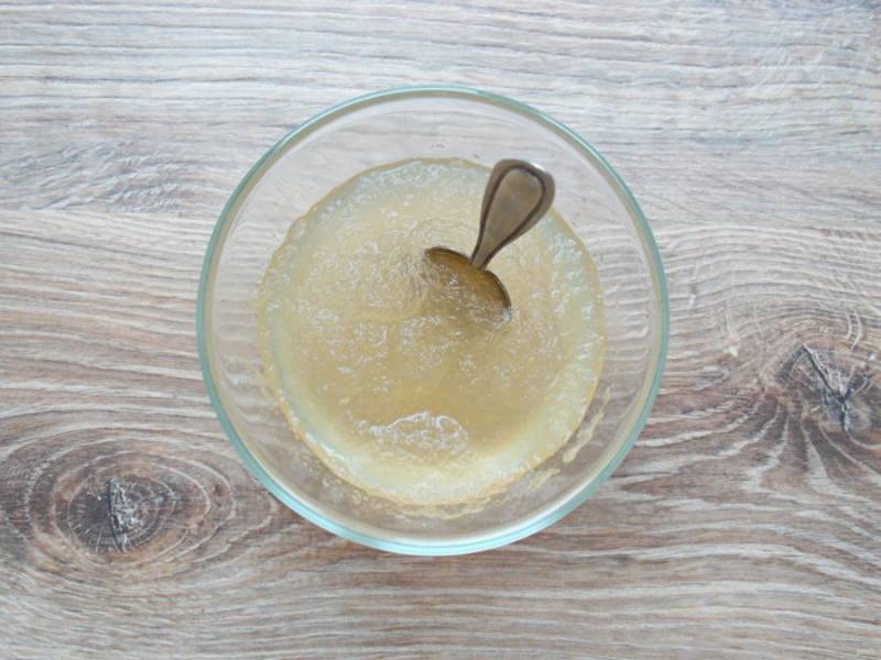 Желатин насыпьте в миску и залейте холодной кипяченой водой. Оставьте для набухания в течение 40-60 минут или по инструкции к вашему виду желатина.