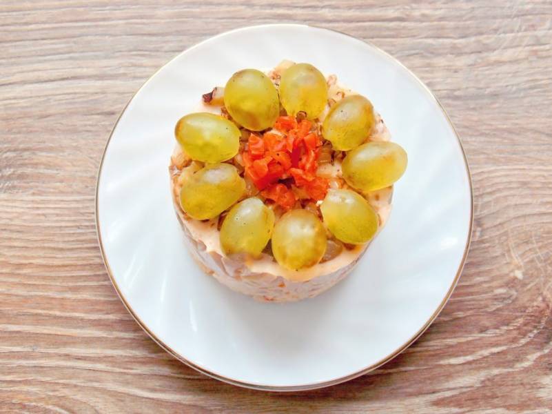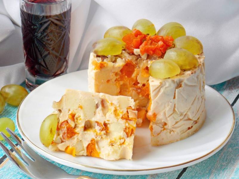 Извлеките торт из холодильника, уберите кулинарное кольцо и пленку. Украсьте верх курагой и виноградом. Сразу подавайте к столу под хорошее полусладкое вино.