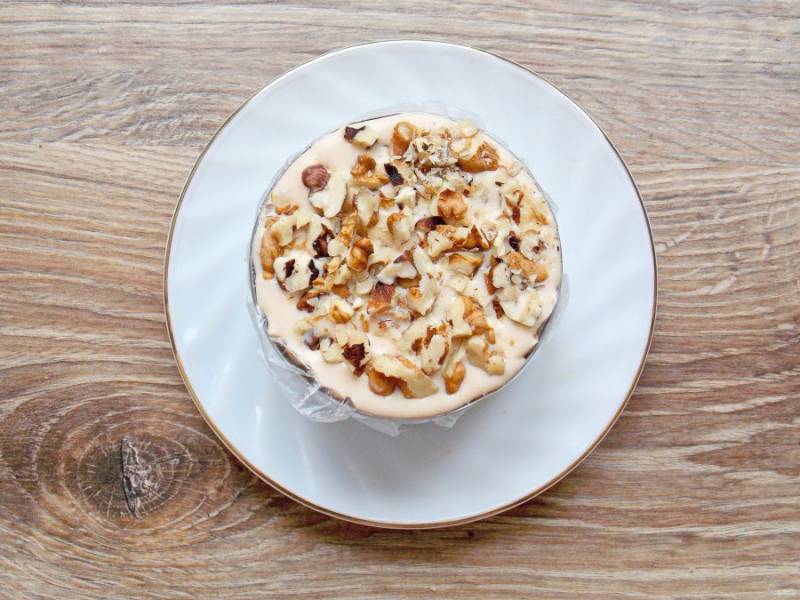 Орехи немного обжарьте на сухой сковороде, остудите и порубите. Засыпьте верх торта грецкими орехами. Уберите закусочный торт в холодильник на несколько часов до полного застывания.