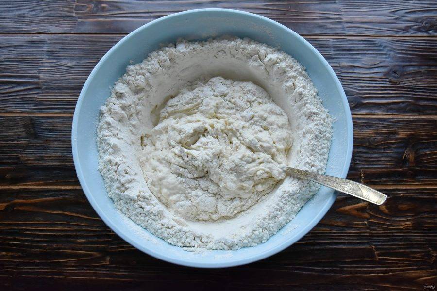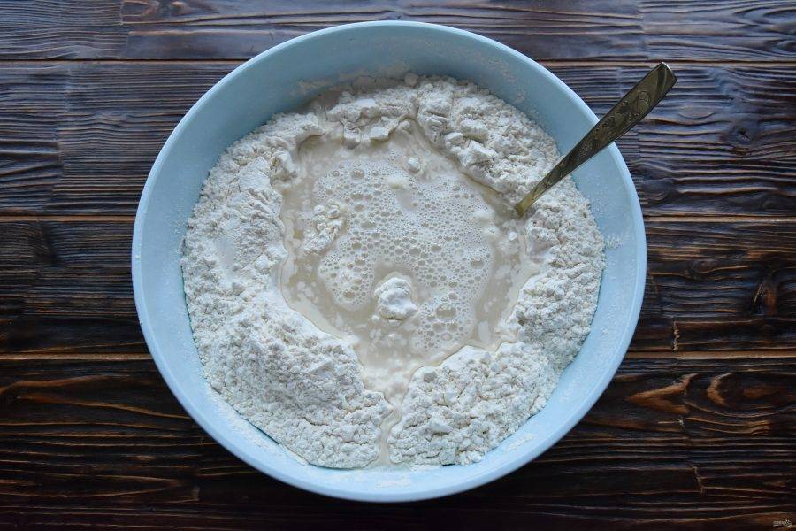 Начните замешивать тесто вилкой, аккуратно подмешивая в жидкость муку с краев воронки, пока вся мука пропитается влагой.