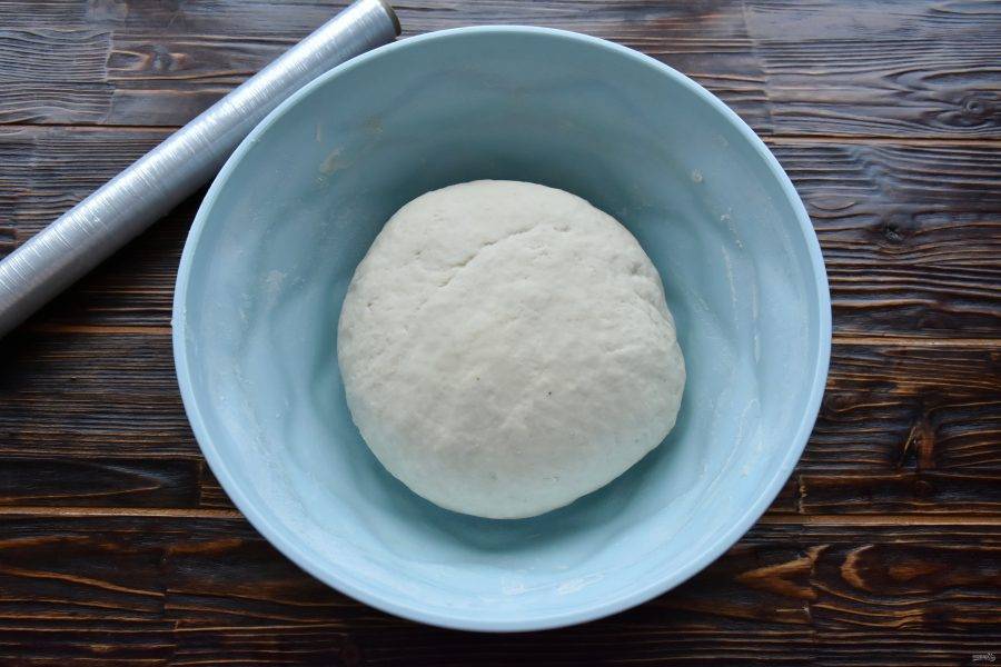 Продолжите месить тесто, выложив его на поверхность. Структура теста получается достаточно плотная и упругая. Округлите заготовку и выложите в миску, накройте кухонным полотенцем или пищевой пленкой и отставьте, что бы тесто отдохнуло.