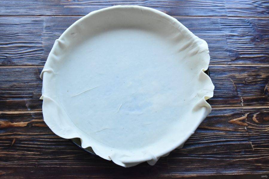 Часть теста, размером побольше, раскатайте в пласт как можно тоньше. Выложите раскатанный лист в форму, присыпанную мукой. Очень удобно раскатывать тесто на силиконизированном коврике, формировать чуду и на нем же выпекать.