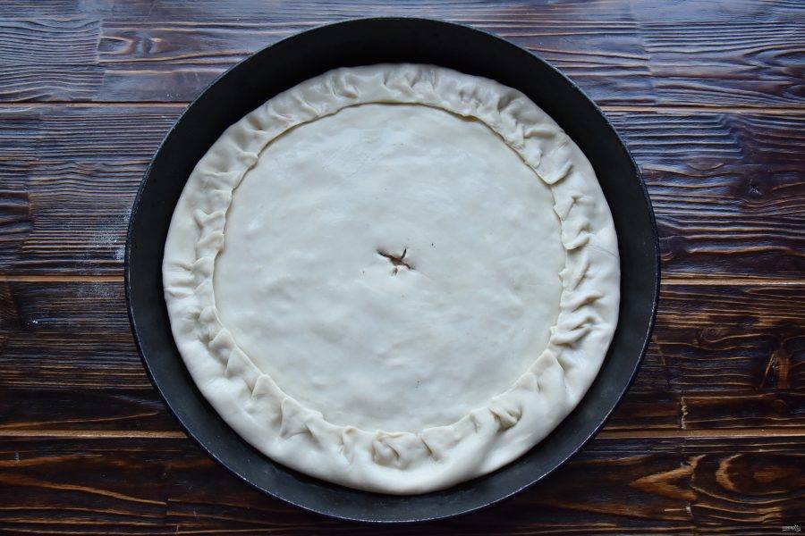 Оставшуюся часть теста раскатайте в круг меньшего диаметра и выложите поверх начинки. Закрепите нижний и верхний слои теста между собой. В центре чуду сделайте отверстие для выхода пара. Сбрызните чуду водой.