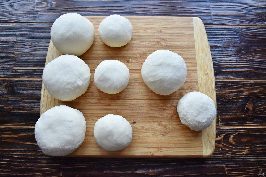 Из данного количества ингредиентов получается 4 больших чуду, диаметром 29-30 см. Тесто разделите на четыре части, весом примерно 380 граммов. В свою очередь каждую часть разделите на две неравные части. Пресное тесто очень быстро подсыхает, поэтому целесообразно накрыть его пленкой или полотенцем.