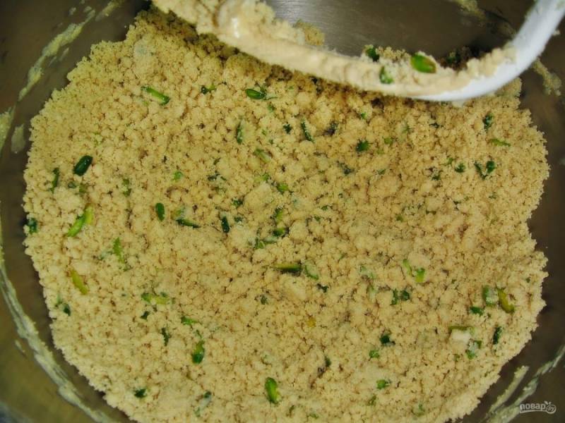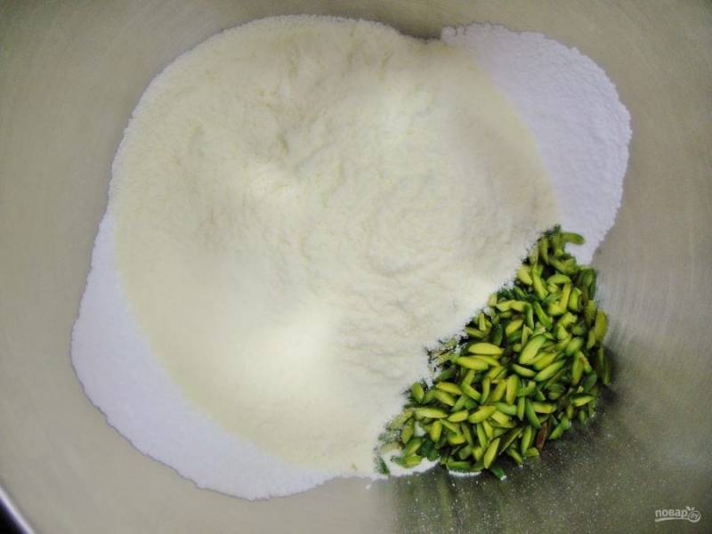 1. Просейте в миску сахарную пудру, чтобы не было комочков, добавьте сухое молоко и измельченные фисташки.