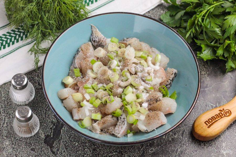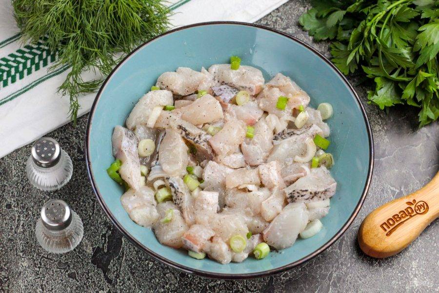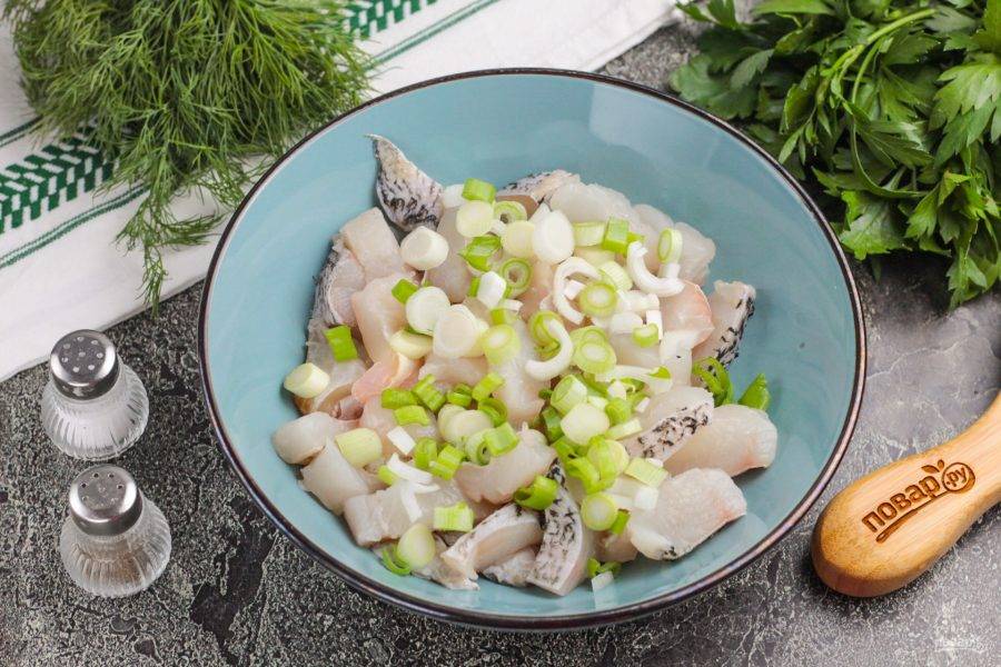 Очистите и промойте лук, нарежьте кольцами или полукольцами, добавьте к рыбе в емкость.