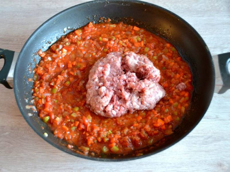 Добавьте в сковороду мясной фарш, накройте крышкой, протушите до готовности.
