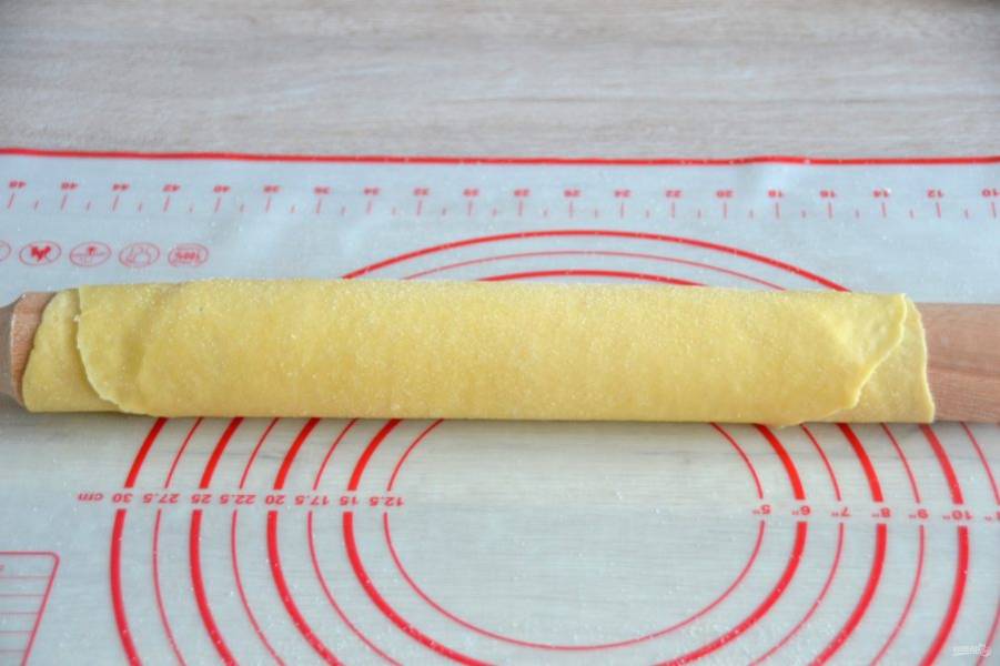 Раскатанное тесто слегка подсыпьте семолиной (можно заменить манкой из пшеницы твердых сортов), сверните в рулон.