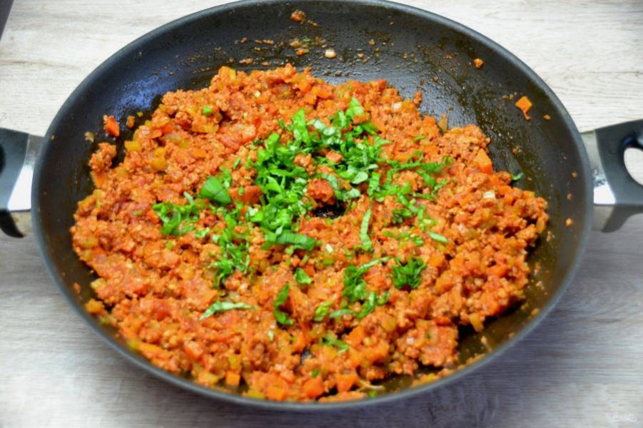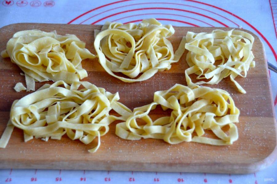 Встряхните полоски тальятелле, сверните их "гнёздами", подсушите, пока занимаетесь приготовлением соуса "болоньезе".