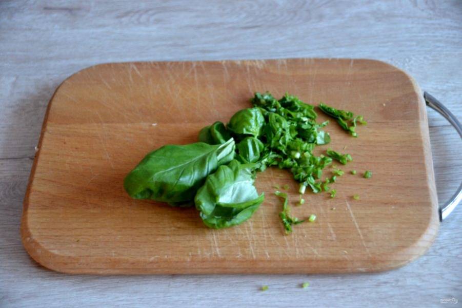 Мелко нарежьте базилик. Если нет свежего базилика, можно заменить на сухой.