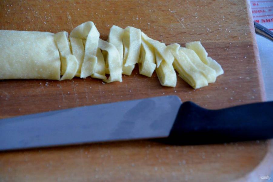 Нарежьте полоски теста шириной 0,8 см., именно такой должна быть ширина тальятелле.