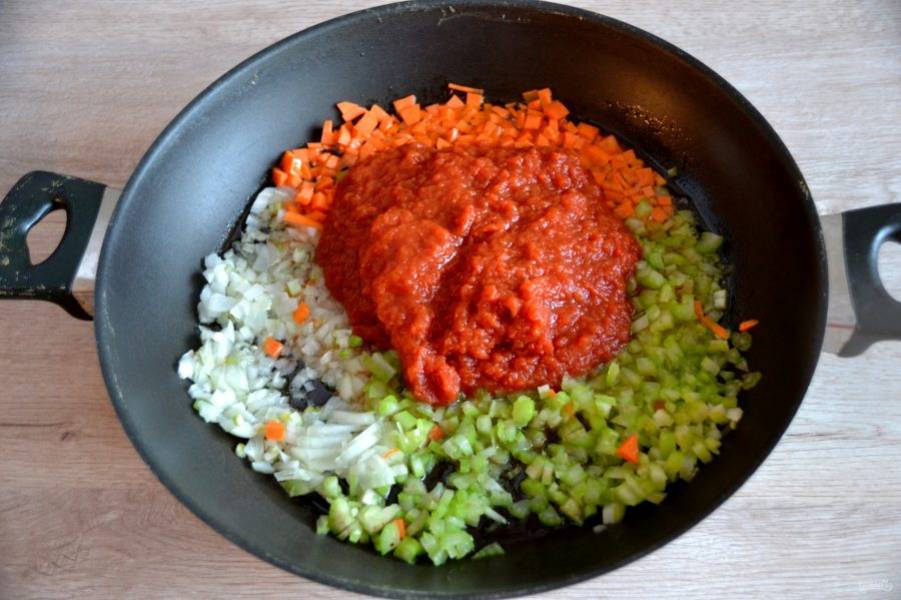 Влейте в сковороду оливковое масло, разогрейте, обжарьте лук, сельдерей и морковь, после чего выложите томаты.