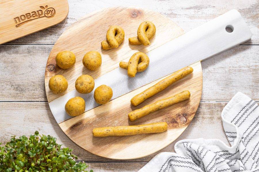 Разделите тесто влажными руками на небольшие кусочки примерно по 8-10 грамм, скатайте их в шарики. Затем скатайте каждый шарик в колбаску. Скрестите концы каждой колбаски и закрепите, придавая им форму таралли.