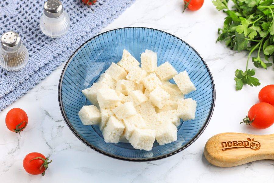 С ломтиков хлеба срежьте горбушки и поджаренные края, оставляя лишь белый мякиш. В рецепте используется только белый хлеб: кирпичик или батон, так как серый и черный хлеб придадут закуске неаппетитный вид. Нарежьте мякиш кубиками или разломите руками в пиалу, креманку. Залейте молоком и прижмите, чтобы хлеб весь замочился. Оставьте на 3-5 минут, а затем слегка отожмите.