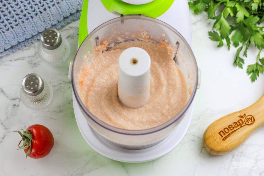 На пульсирующем режиме техники измельчите содержимое емкости в течение 3-4 минут. Вся масса должна отпюрироваться и стать однородной. Тарамасалата полностью готова — попробуйте ее на вкус. По желанию — подкорректируйте его.