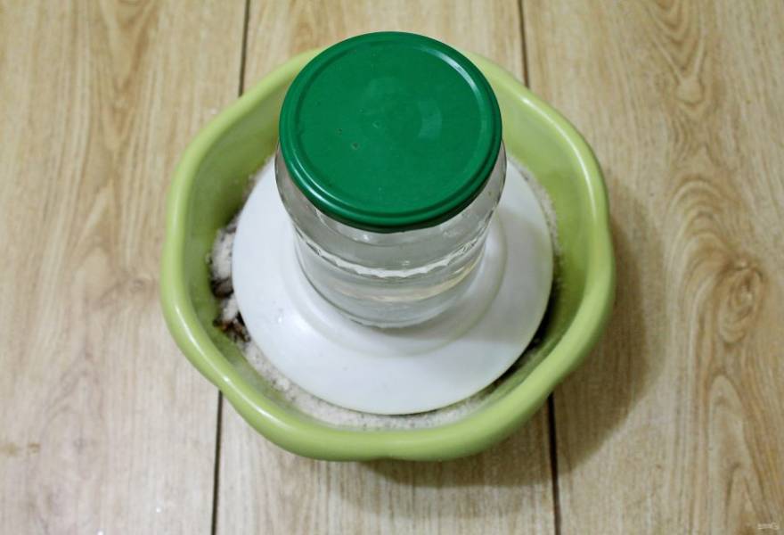Засыпьте верхний слой солью, выложите сверху тарелку и положите груз.