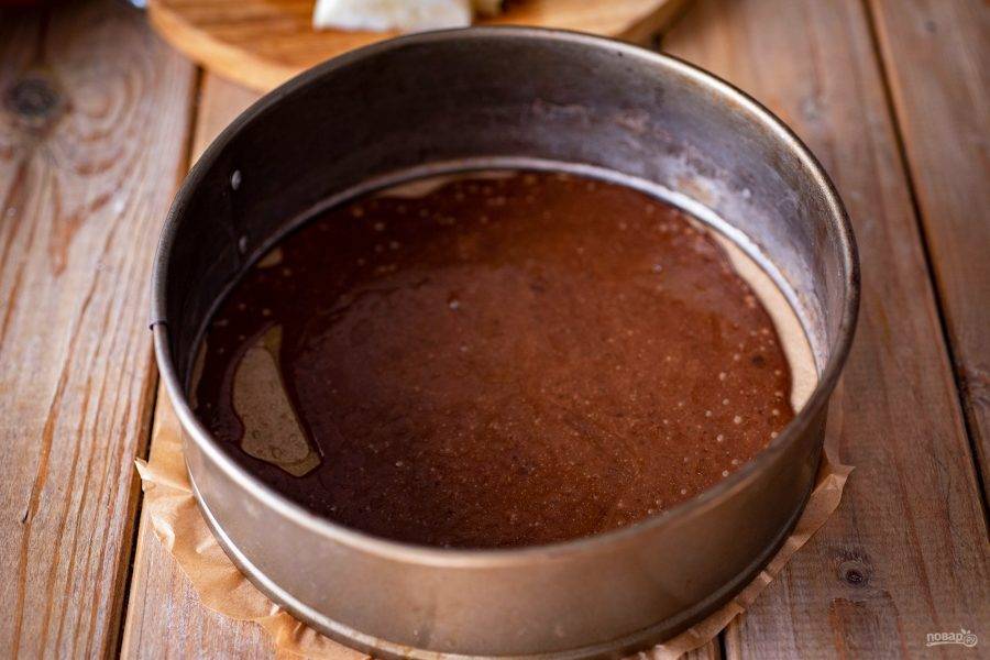 Дно формы для выпекания застелите пергаментом для выпечки. Выложите слоем на подготовленное дно карамельный соус — он достаточно густой, поэтому особо не растекается.