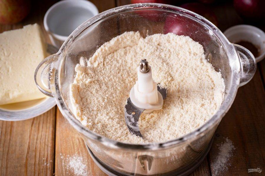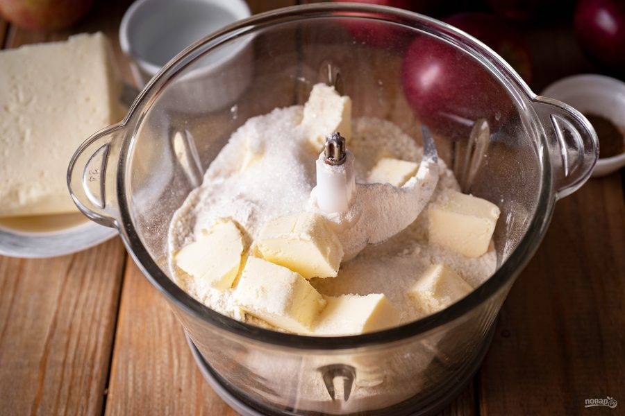 Приготовьте сначала песочное тесто. В чашу блендера выложите всю муку, 150 грамм ледяного масла, нарезанного удобными кусочками, добавьте соль, сахар 20 грамм.