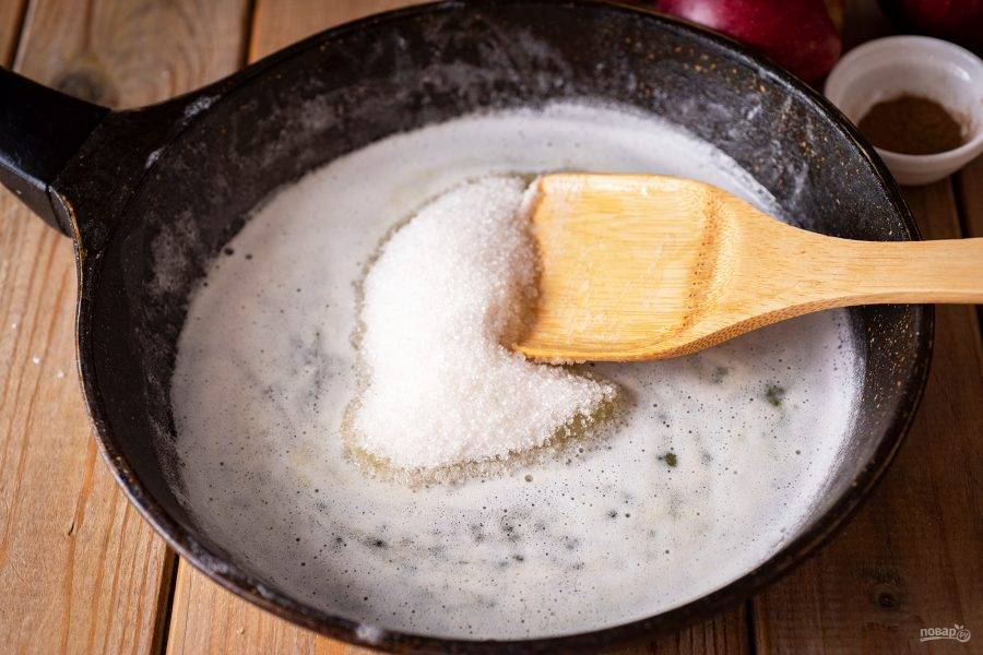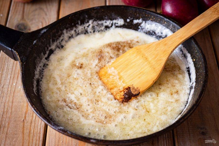 В сковороде на небольшом огне растопите 100 грамм сливочного масла, добавьте к нему 100 грамм сахара, помешивая, дождитесь, когда сахар растворится.