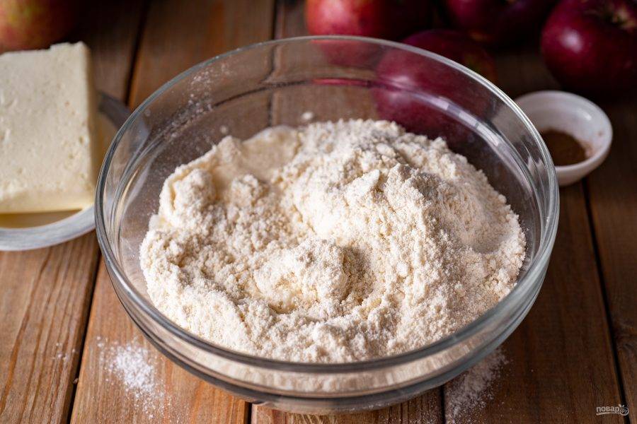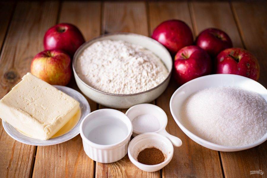 Все ингредиенты выложите на стол перед началом приготовления. Масло для теста должно быть ледяным, поэтому можно заранее поместить его на 15 минут в морозильную камеру.
